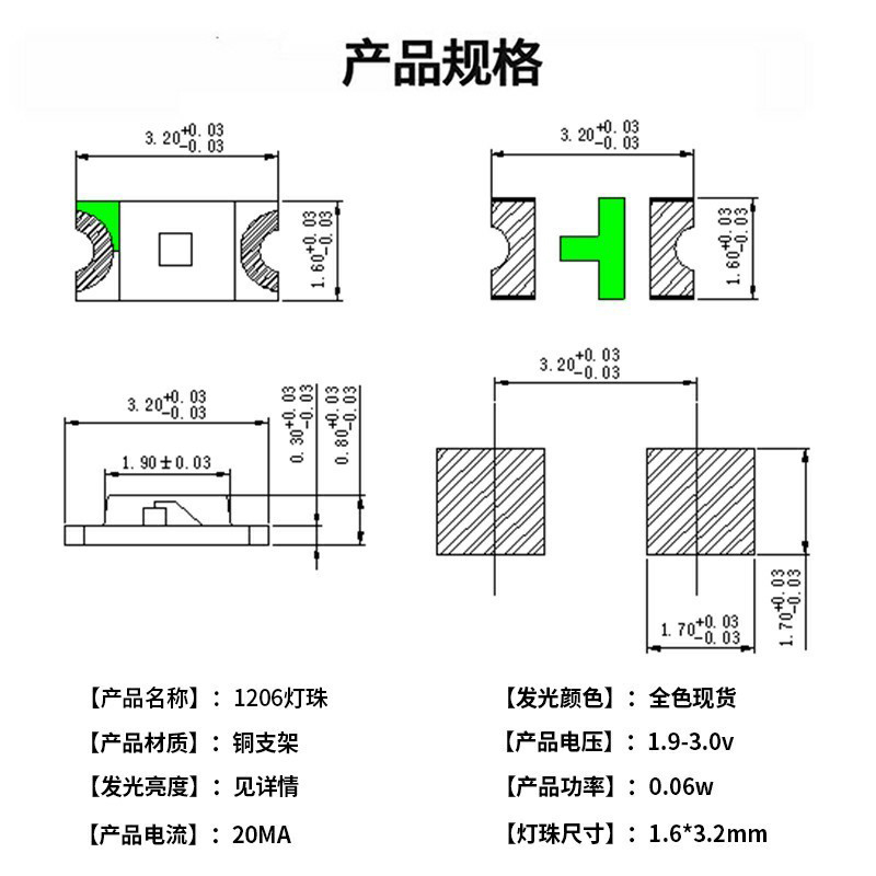• 1206紅藍黃翠綠白色多色系白光led燈珠 金版金線 高亮貼片led燈珠...